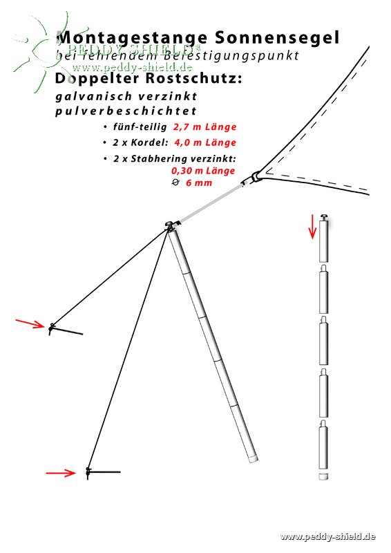 Installations de voiles d'ombrage avec des piquets de soutien qui sont fournis avec une cordelette de 4 m et une sardine de 19 cm quand il n'y a pas de points d'ancrage pour ombrager l'endroit que vous désirez.